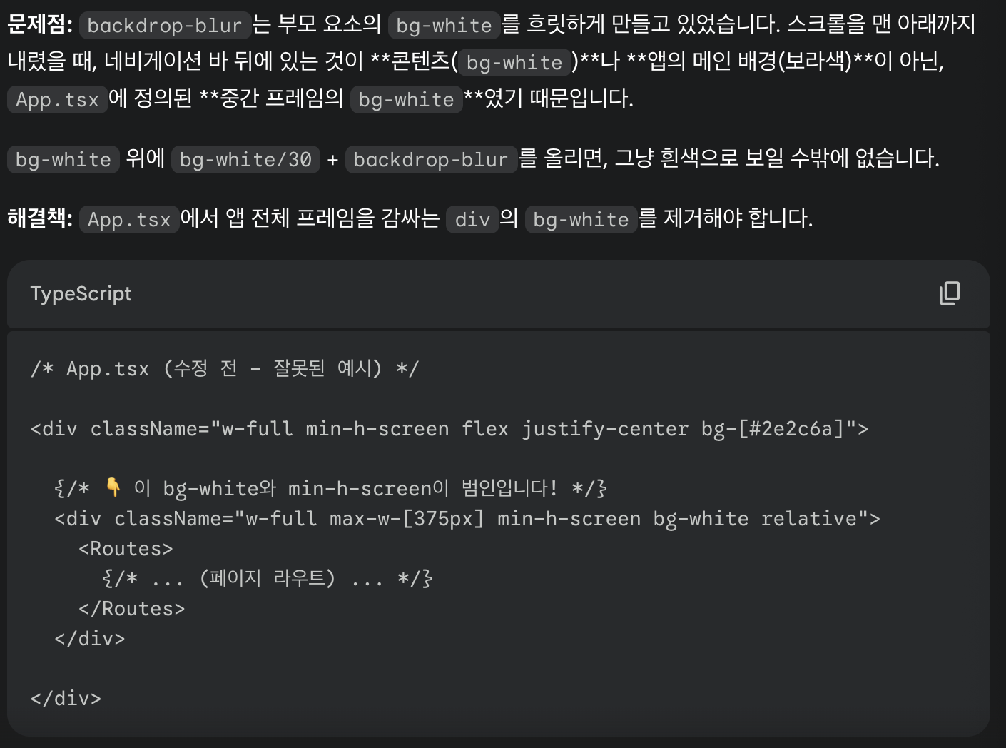먼저 하단 네비게이션 바에 글래스모피즘 효과를 적용하려고 구상했고, Tailwind CSS의 backdrop-blur와 bg-white/30만 쓰면 간단히 끝날 줄 알았는데, 생각지도 못한,, 여러 난관을 겪었습니다.
