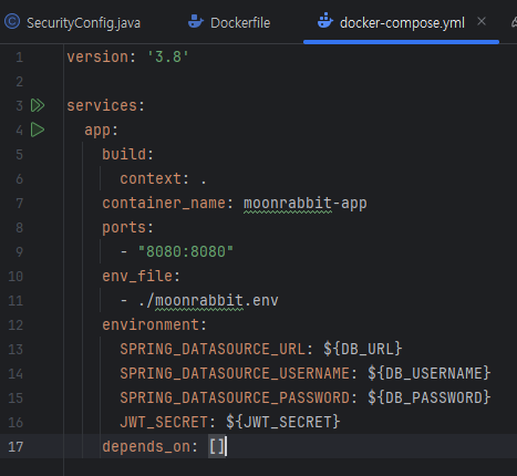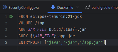 도커파일은 자바21버전, OpenJDK중 가장 많이 쓰이는 eclipse-temurin을 사용해서 베이스 이미지를 작성해주었고, /tmp 디렉토리를 볼륨으로 마운트해서 build/libs 안의 jar 파일을 app.jar로 컨테이너에 복사하도록 설정해주었다. 관련 자료가 많았기에 큰 어려움은 없었다. docker-compose 같은 경우엔 추후 DB를 로컬에서 띄우는 경우나 redis 같은 부분을 함께 사용하고 싶을때 간편하다는 얘기가 있어 작성하게 되었고, 일단은 .env파일 사용하여 데이터를 넣는 식으로 진행했다.