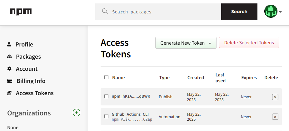 그리고 npm 접근 토큰을 받기 위해 npm 로그인 후 토큰을 생성해주었다.